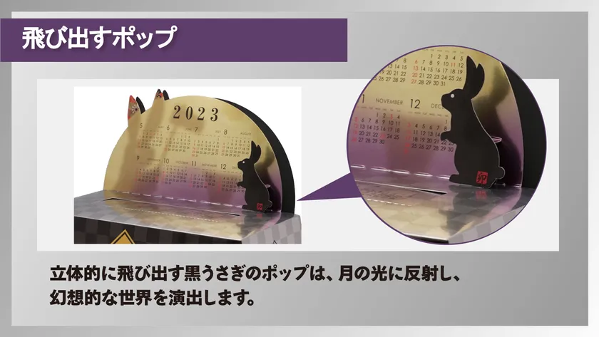 “特別な方へのギフト”“自分へのご褒美”“縁起の良い干支グッズ”など、多様な用途で使える「ハイクオリティ」を追求しました。デザイン性はもちろん、機能性(カレンダー)と実用性(ティッシュケース)を兼ね備えた商品です。