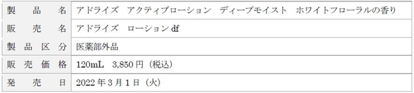 「アドライズ アクティブローション ディープモイスト ホワイトフローラルの香り」は、スキンケアタイムに香りを楽しみたいというリクエストにお応えして、「アドライズ アクティブローション ディープモイスト」に、ブランドイメージの白にちなんだホワイトフローラルの香りを調合したこの春だけの限定品です。リッチな感触の化粧水が、冬の過酷な乾燥シーズンを過ごした肌を香りと共にやさしく包みます。肌をしっとりと潤しながら、明るく透明感※2に満ちた肌に整えます。この春、ホワイトフローラルの香りにつつまれるスキンケアタイムをどうぞお楽しみください。
