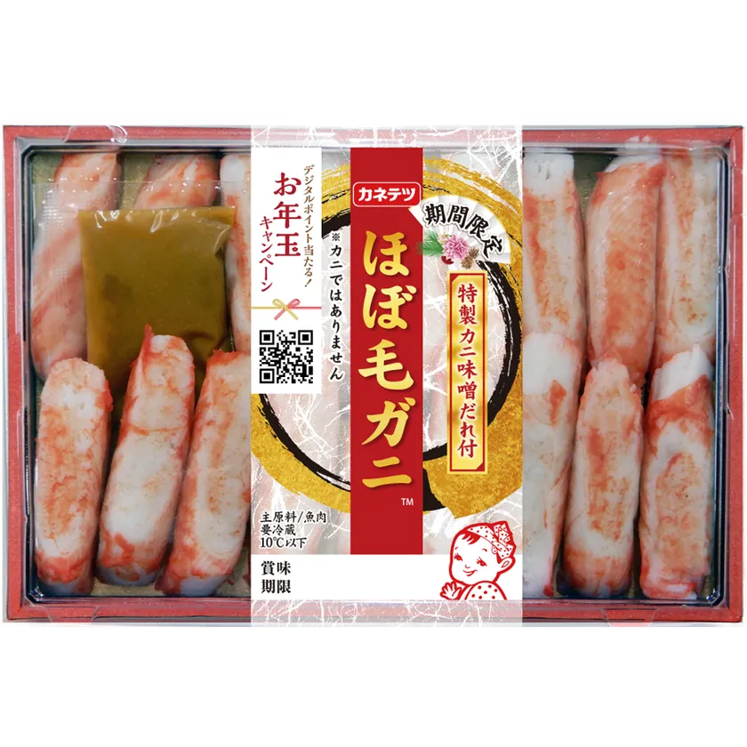 「万福 ほぼズワイガニ」の名前の「万福」にはおなかいっぱいの“満腹”と四字熟語の“新春万福”(たくさんの数え切れないほどの幸せ)の二つの意味を込めました。世界一「ズワイガニ」に近いカニ風味かまぼこを目指して作った本格カニ風味かまぼこ「ほぼカニ」を通常よりも贅沢に太く大きく仕上げています。口の中でふわりとほぐれる繊維感を再現するだけでなく、よりカニを感じていただくために本物のカニの旨味が詰まったカニ味噌だれを添付しております。