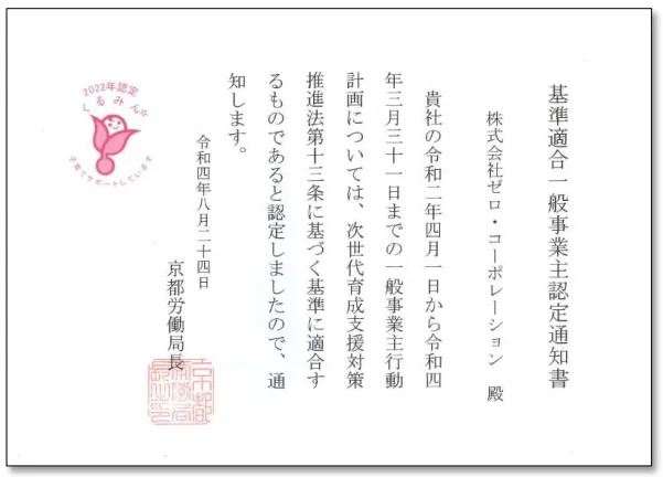 株式会社ゼロ・コーポレーション(本社:京都市中京区、代表取締役社長:菊本雅幸)は、2022年8月24日、次世代育成支援対策推進法(次世代法)に基づく「子育てサポート企業」として、厚生労働省京都労働局より『くるみん』の認定を取得いたしました。