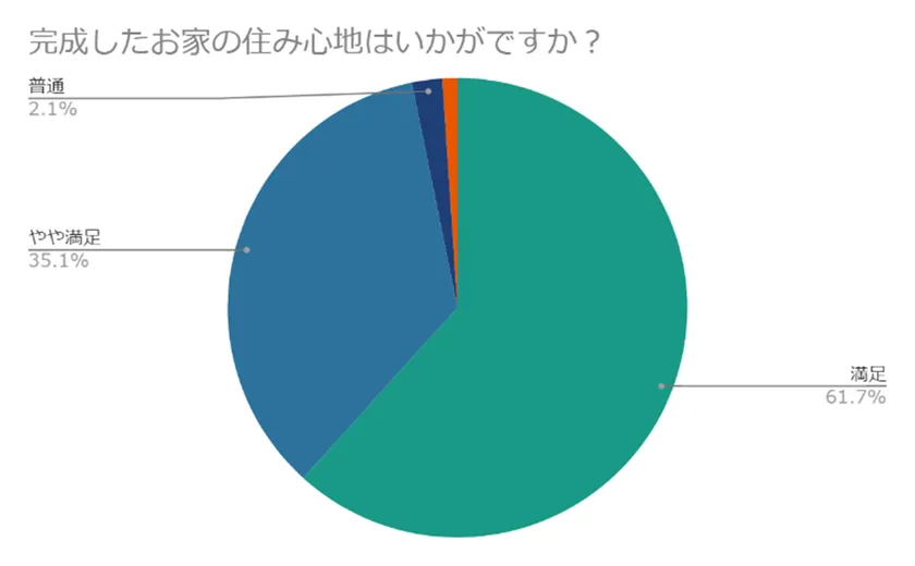 完成したお家に暮らしてからの住み心地は、約97%の方に「満足・やや満足」と回答いただきました。回答を理由については、以下コメントをいただいております。
