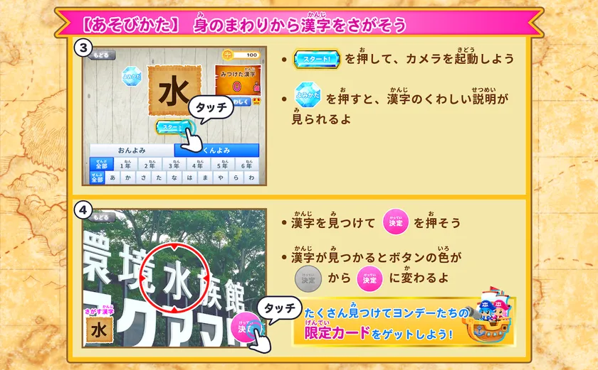『探検島』はLive Textのテキスト認証機能を使用して、家の中や町中など現実環境の中にある「漢字」を見つけるゲームです。たくさんの漢字を見つけて、限定のコレクションカードをゲットしよう!