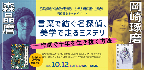 10月12日開催『虚池空白の自由律な事件簿』×『HIPS 機械仕掛けの箱舟』刊行記念 森晶麿×岡崎琢磨トークイベント