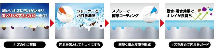 キッチンシンクなどの水まわりに、洗浄後、スプレーして拭き上げるだけで完了。