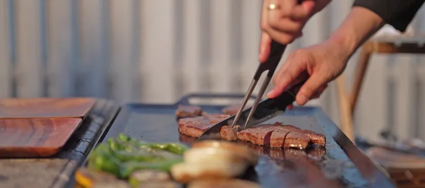 ご自宅はもちろん、貸別荘やプライベートヴィラ、グランピング施設など好きな場所に呼ぶことが可能。いつもは自分で食材を用意しみんなで料理をしている方も、少し贅沢に外の空気を楽しみながら本格鉄板料理を体験できます。