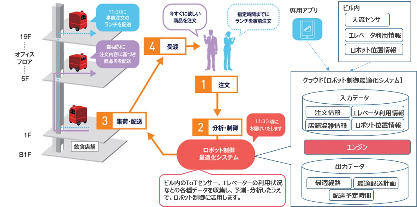 ロボットとビル設備(エレベータなど)のシームレスな連携が普及しつつあり、ロボットによる配送可能な環境が整う中、ロボットに行き先を指定して配達する従来の仕組みから、今回の実証では、ロボットやエレベーターなどのビル設備情報や経路・店舗の混雑情報などをクラウドに集めて、最適化シミュレーションを実施し、注文受領後にロボットが人の指示を介さずに自律的に最適なルートを検索して、店舗へ集荷、該当フロアへの配送をすることをめざします。