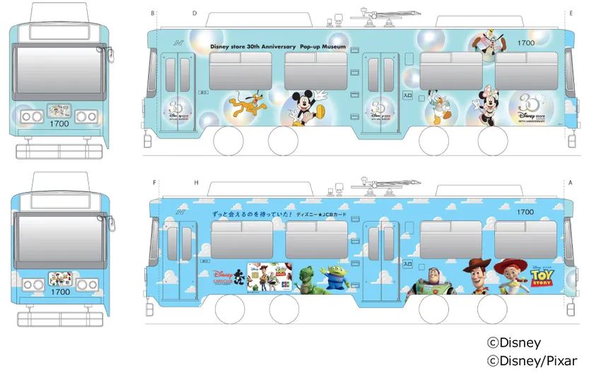 ラッピングが施されるのは、長崎市内を南北に走る路面電車「長崎電気軌道」の車両と、鹿児島市内全域を走るバス「鹿児島市営バス」の車両です。どちらも片面は「ディズニーストア」に関連したデザイン、もう片面は「ディズニー★JCBカード」に新登場したトイ・ストーリーがモチーフのデザインとなっています。長崎と鹿児島には過去にディズニーストアの店舗があり、この度の「Disney store 30th Anniversary Pop-up Museum」の開催とラッピング車両の走行により、もう一度ディズニーストアを身近に感じていただく機会を提供します。