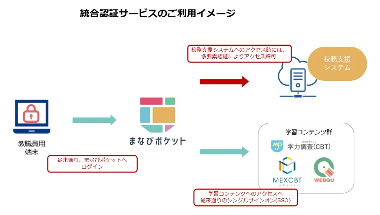 2022年3月に文部科学省「情報セキュリティポリシーに関するガイドライン」が改訂され、アクセス制御によるセキュリティ対策が認められました。「まなびポケット」では、同ガイドラインに準拠した多要素認証・リスクベース認証を実現する統合認証サービスをご提供します。