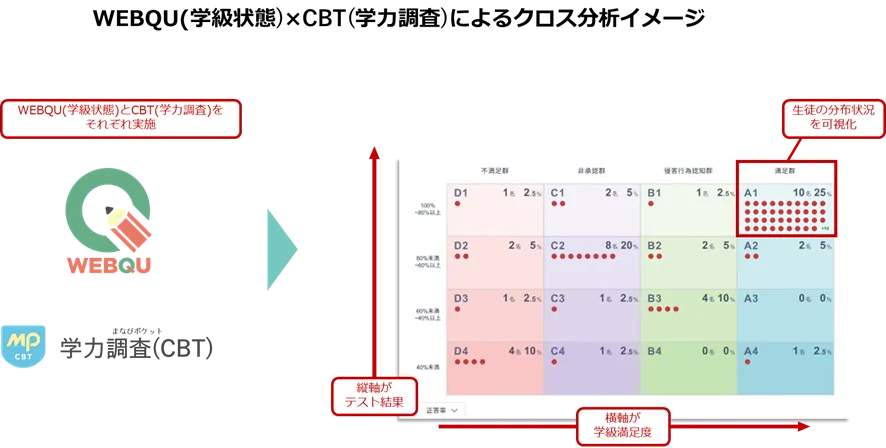 学級の経営状態がわかる「WEBQU」と、学力の状態がわかる「まなびポケットCBT」を組み合わせることにより、児童・生徒の心理状態や学級の経営状態が学力向上にどのような影響を与えているかを可視化することが可能です。これにより児童・生徒、教職員による一人ひとりにあった個別最適な指導の実現をサポートします。