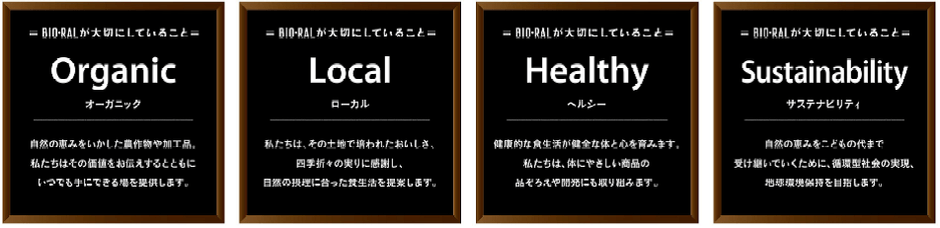 ドイツ語「BIOLOGISCH(有機の)」と英語「NATURAL(自然)」からなる造語。“素敵なナチュラルライフスタイルを通じて、心も体も健康で美しく豊かな毎日を過ごしてもらいたい”と願うスーパーマーケットです。「オーガニック・ローカル・ヘルシー・サステナビリティ」をコンセプトに、ナチュラルライフスタイルをご提案し、お客様の心と体の健康と豊かな日々をお手伝いできるよう魅力ある商品を提供しています。