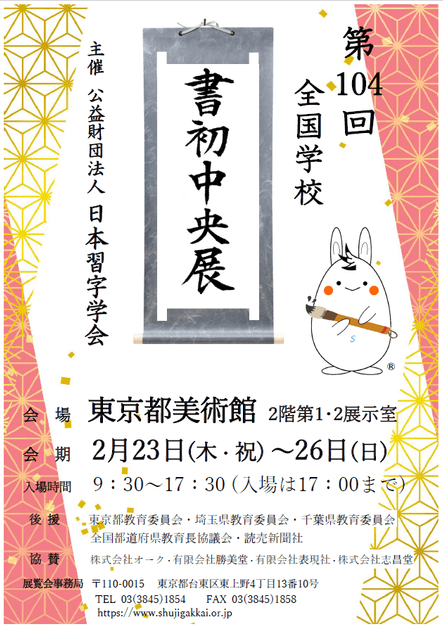 『第104回 全国学校書初中央展』は公益財団法人日本習字学会が主催する書初展覧会です。幼児、小学生から一般の方まで多くの毛筆・硬筆作品が集まり展示されます!