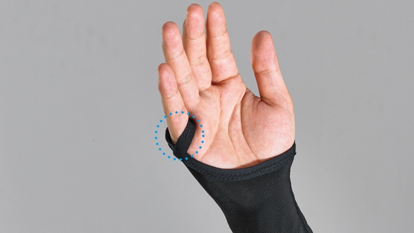 手首を絞り掌底まで広く一体で覆うラッパ形状の場合、長時間のプレーの最中に掌底部の布地が手首付近にズレ落ちやすくなります。そこで、ずれ落ち防止のため、マウス操作に干渉しない小指に引っ掛ける非常にソフトなフックを搭載しました(特許出願中)。