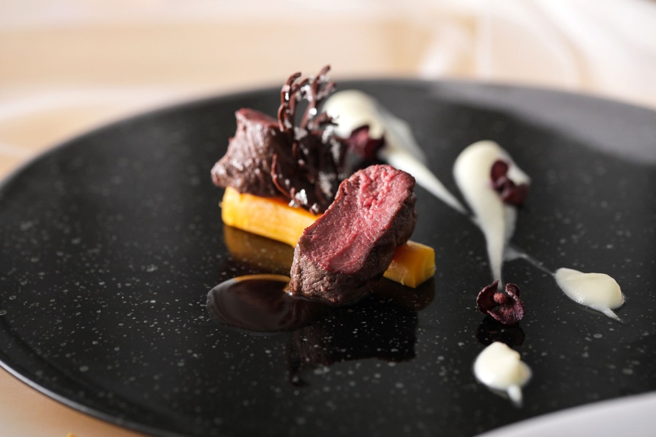 蝦夷鹿と国産・黄人参のロースト パースニップのピュレ マダガスカル産ペッパーのポワブラードソース