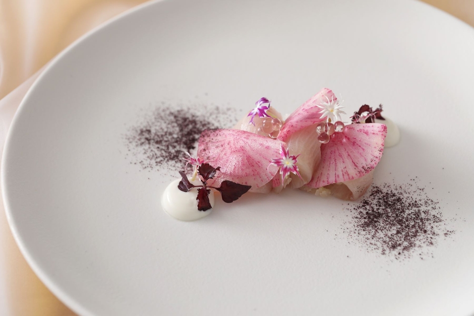旬魚と紅しぐれ大根のトランシェ 生姜のラヴィゴット コールラビのムースリーヌとピンクパールバルサミコ