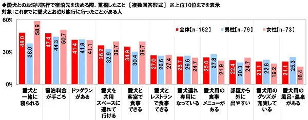 男女別にみると、「愛犬と一緒に寝られる」(男性38.0%、女性58.9%)は男性と比べて女性のほうが20.9ポイント高くなり、「愛犬用の風呂・温泉がある」(男性25.3%、女性16.4%)は女性と比べて男性のほうが8.9ポイント高くなりました。