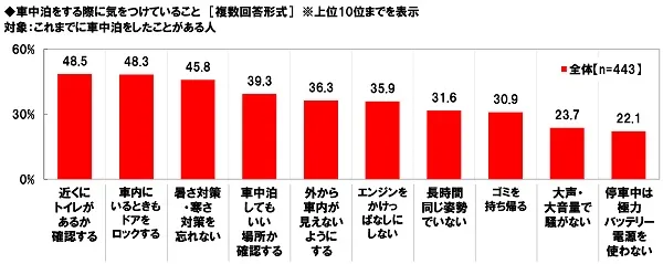 これまでに車中泊をしたことがある人(443名)に、車中泊をする際に気をつけていることを聞いたところ、「近くにトイレがあるか確認する」(48.5%)が最も高く、「車内にいるときもドアをロックする」(48.3%)、「暑さ対策・寒さ対策を忘れない」(45.8%)、「車中泊してもいい場所か確認する」(39.3%)、「外から車内が見えないようにする」(36.3%)が続きました。駐車場所選びや防犯・プライバシー対策、暑さ・寒さ対策に留意している人が多いようです。