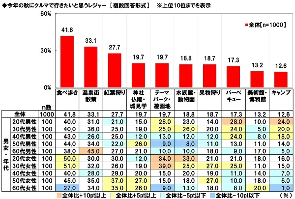 全回答者(1,000名)に、今年の秋にクルマで行きたいと思うレジャーを聞いたところ、「食べ歩き」(41.8%)が最も高く、次いで、「温泉街散策」(33.1%)、「紅葉狩り」(27.7%)、「神社仏閣・城見学」「テーマパーク・遊園地」(いずれも19.7%)となりました。