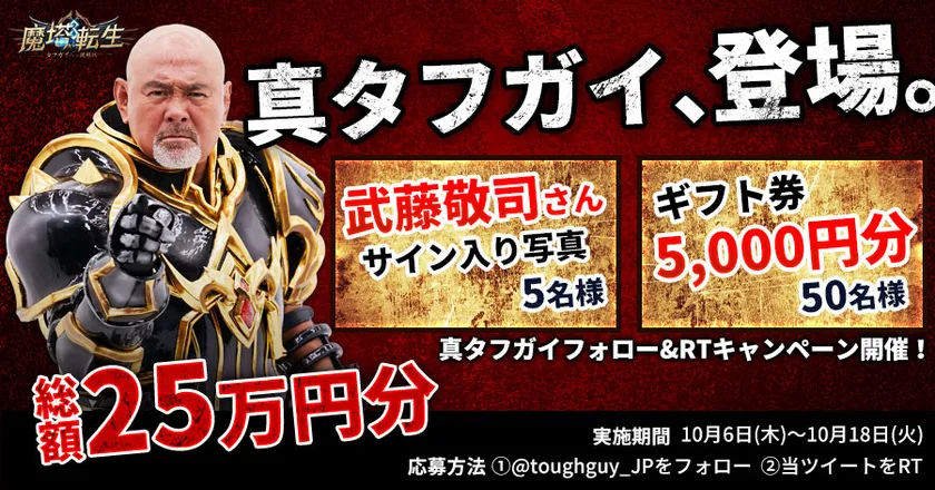 Sky Entertainment Network Limitedは、配信予定のスマートフォン向け新作アプリ「魔塔転生:タフガイへの挑戦状」(以下、『魔塔転生』)におきまして、アンバサダー「真タフガイ」として闘魂三銃士の1人、レジェンドプロレスラーの武藤敬司さんを起用したことを発表致しました。また、「真タフガイ」就任と共に、武藤敬司さんが出演のWebCMも10月6日(木)より公式Twitterと公式YouTubeにて披露し、限定の「総額25万円分」アマギフがもらえるフォロー&RTキャンペーンも公開しています。興味がある方は是非、公式Twitter「 @toughguy_JP 」をフォローして、最新のキャンペーン情報をチェックしてみてください!