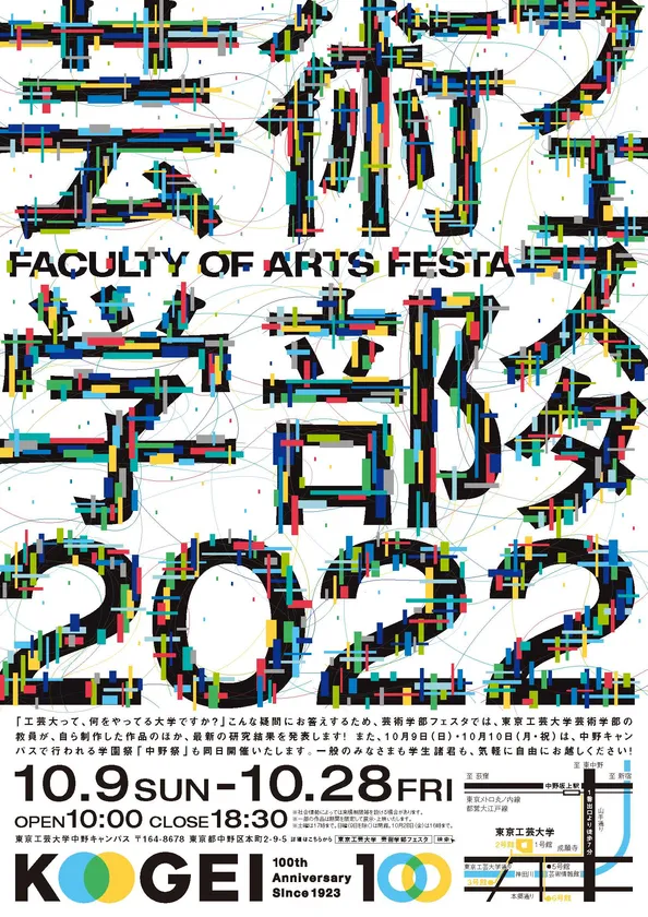 東京工芸大学(学長:吉野弘章、所在地:東京都中野区、以下 本学)芸術学部は、2022年10月9日(日)から10月28日(金)まで「芸術学部フェスタ2022」(以下、本イベント)を開催します。本イベントは本学芸術学部の教員が制作した作品や最新の研究成果を発表することで、本学芸術学部の「メディア芸術」を中心とする研究内容を広く周知することを目的としています。入場無料、誰でも参加可能です。