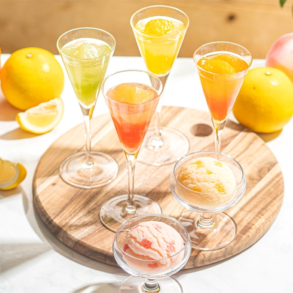 国産フルーツ果汁を使用した2層仕立てのジュレと、国産フルーツをヨーグルト味に仕上げた爽やかな味わいのソルベの詰め合わせ。