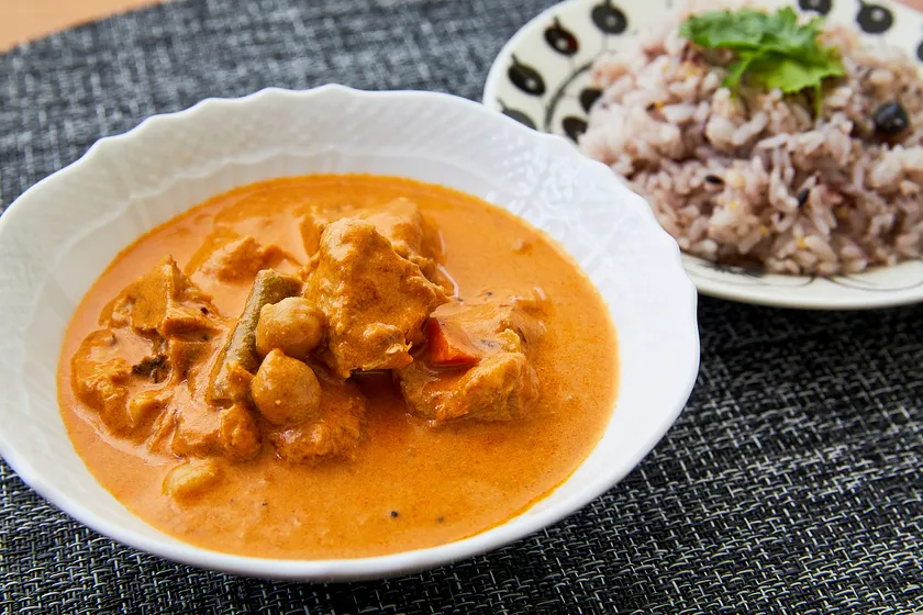 <カレー>は南インドから直輸入した新鮮なオーガニックスパイスをふんだんに使用しました。スパイスの爽快感がお楽しみいただけます。無添加、無化調、砂糖、小麦粉不使用。油も極力使わずに作ったヘルシーなカレーです。