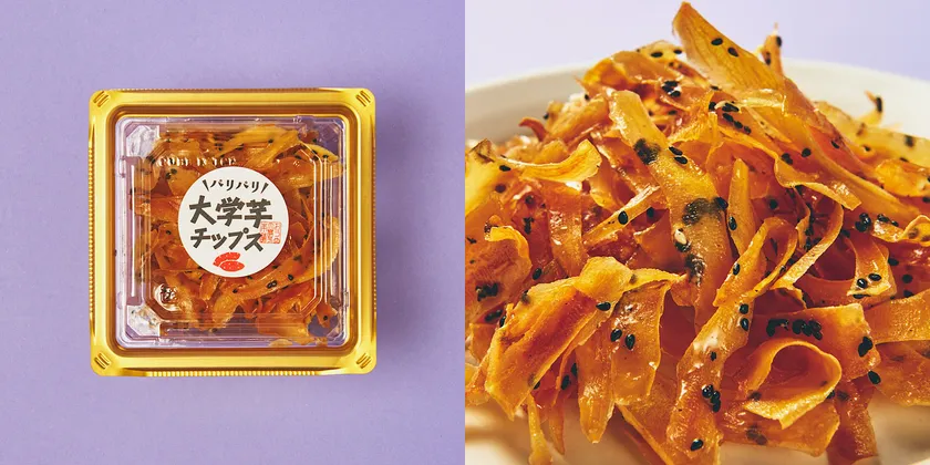大学芋を作る工程でカットした部分を、薄くスライスし、独自の製法でパリパリに揚げて蜜をかけたお芋チップス。食べ始めたら最後、手が止まらない美味しさです。