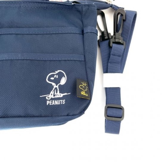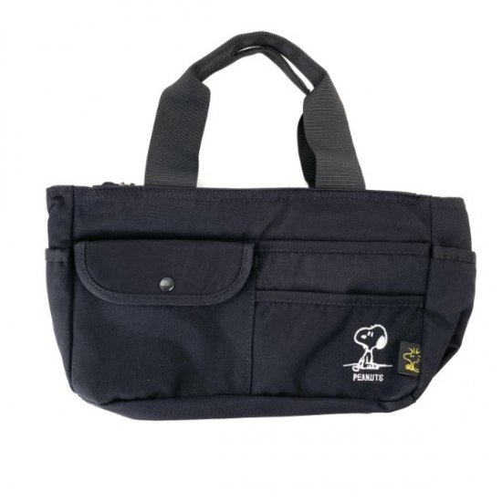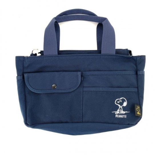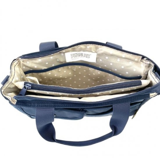 スヌーピーのワンポイントがシンプル可愛いバッグ。横のタグ部分にはウッドストックも隠れています。無地のネイビーカラーというキャラクターグッズ感をあまり主張しない持ちやすいデザインが、最高なんです。