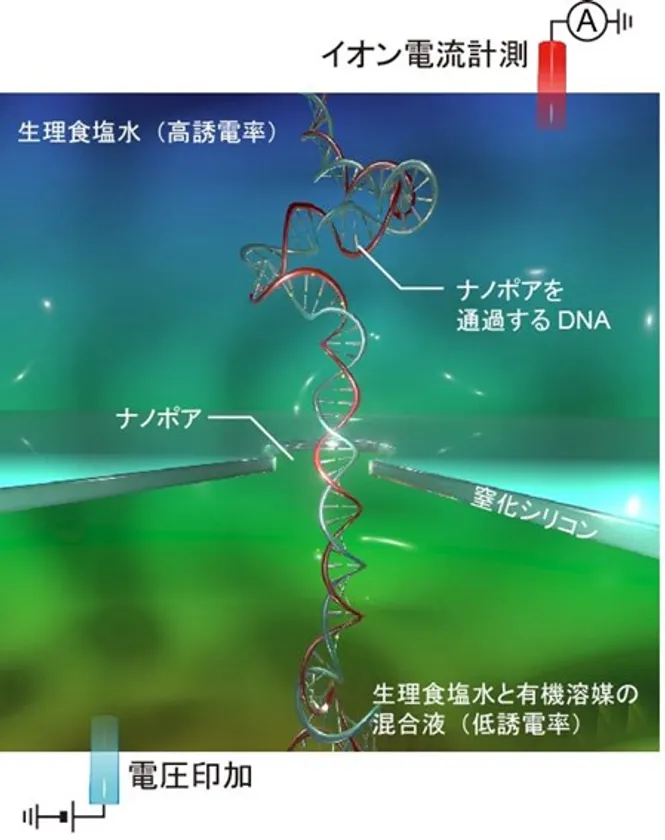 そこで当共同研究グループでは、生理食塩水の誘電率を変えることで、DNAの周囲に集まるカチオンの効果を制御しました。その結果、ナノポアの片側にエタノールやグリセロールを加えるだけで(図1)、DNAのイオン電流信号を数十倍にまで増強できることを明らかにしました。本成果により、ナノポアセンサの1分子感度が飛躍的に向上し、固体ナノポア1分子シークェンサーを大きく実現に近づけることが期待されます。
