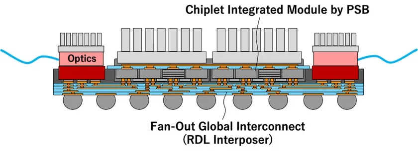 このように、PSB構造はブリッジ接続によるチップレット集積に関してシンプルで合理的な構造を有しており、これにFan-Out 機能を有する配線層(例えばRDL Interposer)を接続することで、図3に示すような理想的なチップレット集積パッケージや、図4に示すような大規模なチップレット集積システムを構成することができます。