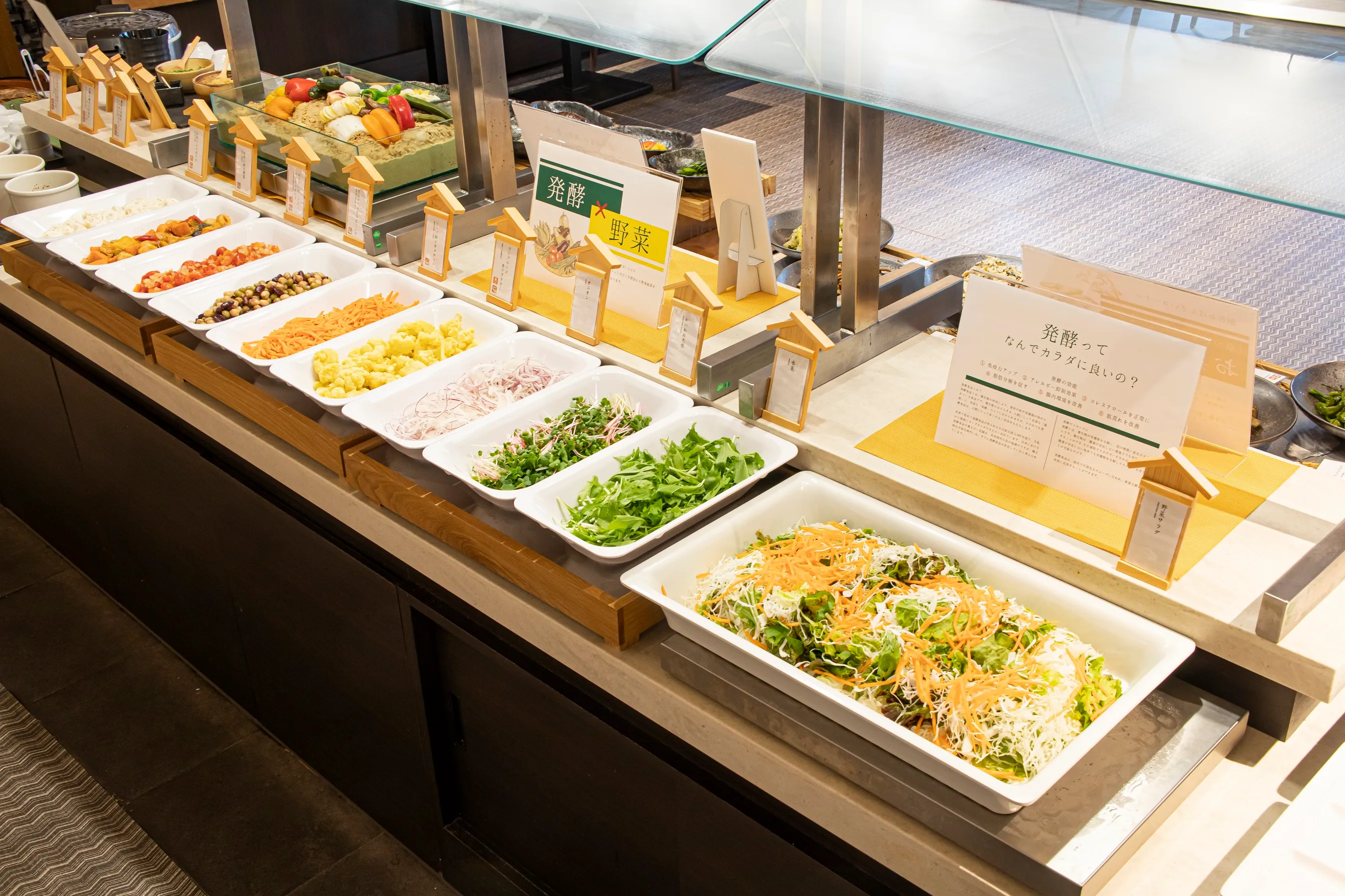 京都の老舗漬物店「西利」の漬物を使ったおばんざいや糠床のお漬物、京都伝統の豆腐店「並河商店」の豆腐や京都祇園で行列ができる米料亭「八代目儀兵衛」のご飯など、“京都”を存分にお楽しみいただけます。また、京都発祥といわれる「鯖寿司」をお客さまの目の前でお作りいたします。さらに「発酵×野菜」をテーマにシェフが野菜にひと手間加えたサラダや惣菜、クレンズスープなども提供し、合わせて70種以上の食材を使用してお料理やお飲み物をご用意いたします。