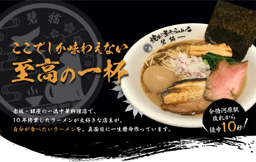 府中分倍河原駅から歩いて10秒!ラーメン通に評判のお店『焼あご煮干しらぁめん碧猫』では、OPEN2周年の感謝として、ご来店いただいた方にラーメントッピング無料券を差し上げます。選べるトッピングはチャーシュー、味玉、メンマ、和え玉(替え玉)などをご用意しています。