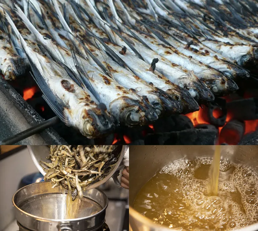 海上を飛び跳ねるあごは身が引き締まり脂肪が少なく、とても澄んだ甘みのある出汁が特徴。通常の煮干しと違い、手作業にて炭火で焼いているので旨みがさらに凝縮されています。