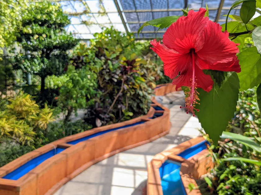 南国を象徴する「ハイビスカス」や沖縄三大名花にも数えらえる「サンダンカ」に囲まれながら楽しめるのがザリガニ釣り、イモリ釣り、やどかり釣り、熱帯魚すくいだ。