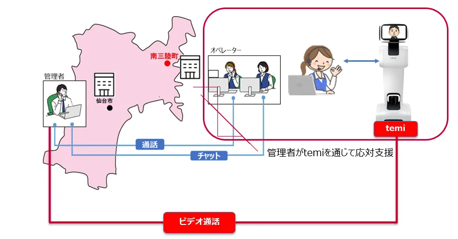 本センターは、地方雇用創出を目的に、2022年2月に南三陸町に開設されました。本センターには電話対応するオペレーターのみが常駐し、仙台の拠点にいる管理者はテキストチャットを通じた電話対応中の支援や、WEB会議システムを使った応対後の指導などを行っています。本センター開設以来、「テキストチャットでは、管理者が応対中のオペレーターの様子を十分に把握することが難しく、適切なアドバイスができない」などの課題がありました。「管理者が現地で支援する環境にできるだけ近づける」ことをめざし、実証実験を経て「temi」の導入に至りました。