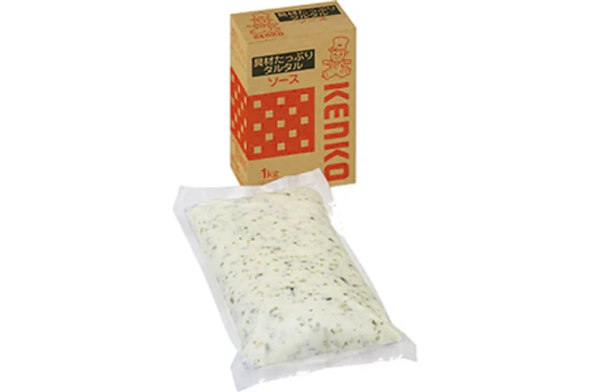 具材感と食感を追求したタルタルソースです。2種類(きゅうりとたまねぎ)のピクルスのシャキシャキとした食感や、ほんのり香る爽やかなディルの風味が楽しめる、やや甘めの味付けです。