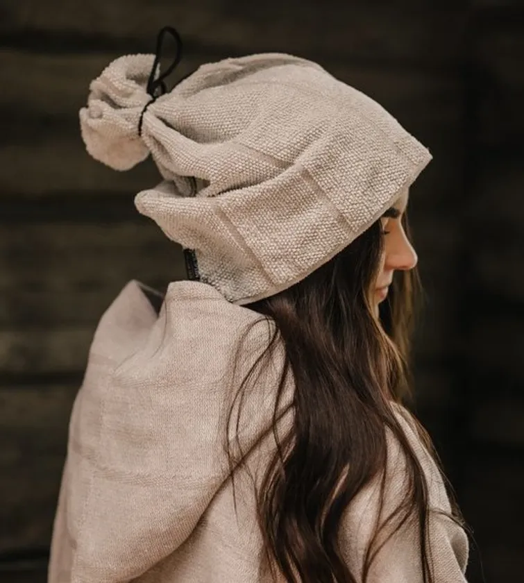 頭・毛髪をサウナの過熱から保護するためのハット。吸水性・速乾性に優れるリネンを使用しています。汗・水を吸水し、すばやく放湿してくれます。ハリのある生地感のフラット織と、タオル地でシャリっとした触り心地が特徴のテリー織といった各織種の個性のある触り心地を楽しめます。