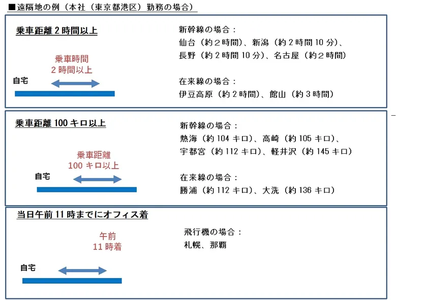 1. 日本国内で、自宅からオフィスまでの公共交通機関の乗車時間が2時間以上、または乗車距離が100Km以上であること。