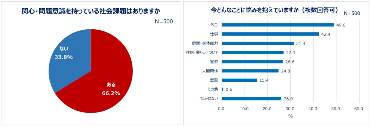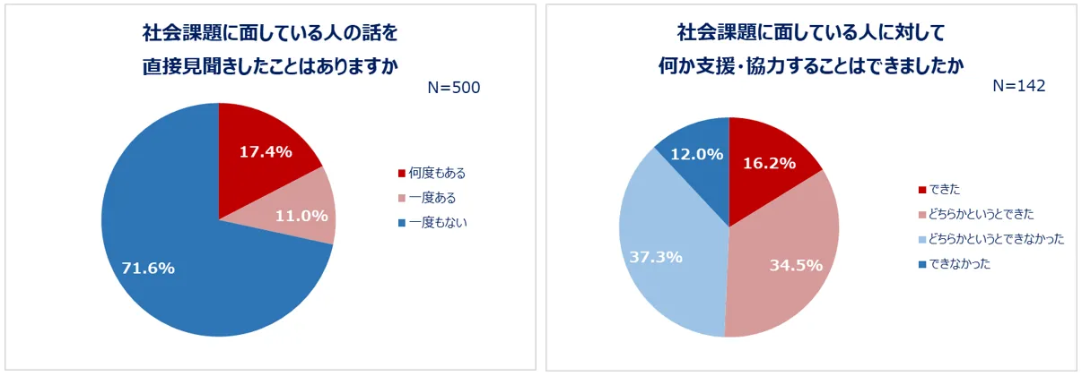現代社会において、貧困・虐待・育児ノイローゼ・いじめなどの社会課題に悩んでいる女性が多くいます。本調査では、現在問題意識を持っている社会課題があるかなど、女性たちの社会課題・社会貢献への意識について聞きました。6割以上が問題意識を持っている社会課題があること、買い物をするとき「販売元が社会課題に取り組んでいるか」を購入の基準としている人は約半数いることなど、社会貢献に前向きな女性は多いと判明。一方で、社会課題に面している人の話を直接見聞きした経験がある人のうち、約半数は「相手を支援できなかった」と回答し、貢献したい気持ちはあるものの「どう支援するべきか分からない」と感じている人も多い実情が明らかになりました。