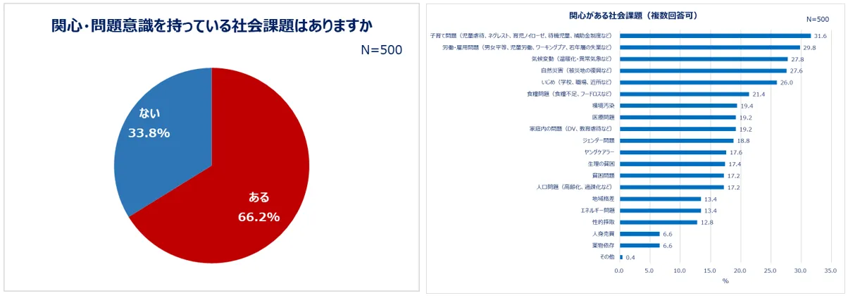 貧困・虐待・DV・性的搾取・育児ノイローゼ・いじめ・薬物依存など、現代社会には解決すべき様々な社会課題があります。関心や問題意識を持っている社会課題がある人は、6割以上いました。具体的には「子育て問題(児童虐待、ネグレスト、育児ノイローゼ、待機児童、補助金制度など)(31.6%)」「労働・雇用問題(男女平等、児童労働、ワーキングプア、若年層の失業など)(29.8%)」に関心を持っている人が多いことが分かりました。