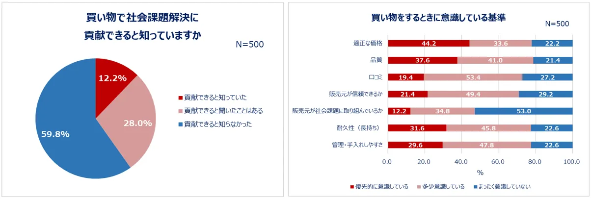 様々な社会課題が顕在化するにつれて、社会課題解決に取り組む団体や、協力企業も増えました。社会貢献している企業の商品を購入することで売上の一部が支援団体に寄付されるなど、日常生活の中で社会課題解決に貢献できる機会も増えています。このように、買い物で社会課題解決に貢献できると知っているか聞いたところ、「知っていた(12.2%)」または「貢献できると聞いたことはある(28.0%)」と回答した人は40.2%でした。一方で、物を買うときの基準として「販売元が社会課題に取り組んでいるか」を意識している人は47.0%。社会課題に取り組んでいる企業の商品を積極的に購入しながらも、その行動自体が社会課題解決の支援につながっていることまでは知らない人は、一定数いると考えられます。
