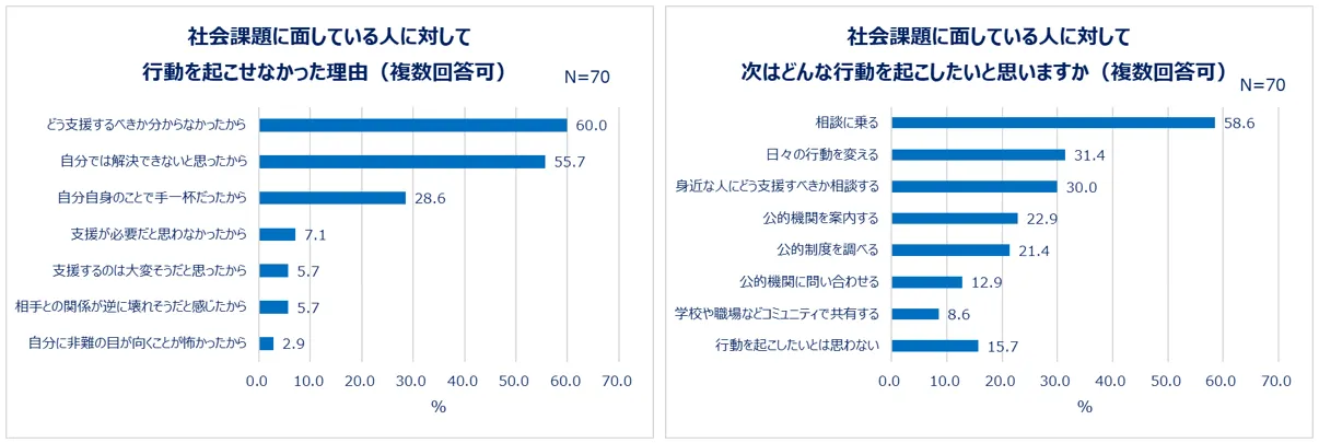 支援・協力することができなかったと回答した人に、行動を起こせなかった理由を聞いたところ「どう支援するべきか分からなかった(60.0%)」「自分では解決できないと思った(55.7%)」に多くの回答が集まり、社会課題に対してなんとかしたいという思いはありながらも、具体的にどうすればいいのか分からない、力不足だと思っている女性は多いことが分かります。今後社会課題に面している人と接したとき、どんな行動を起こしたいか聞いたところ「行動を起こしたいとは思わない(15.7%)」と回答した人を除いて8割以上が何か行動したいと考えていることが分かりました。