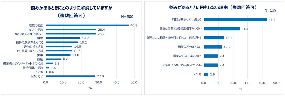 悩みがあるときの解消法は「家族に相談(46.8%)」「友人に相談(28.4%)」「ネットで調べる(28.2%)」という人が多い中、「何もしない(27.8%)」という人も約3割いました。何もしない理由としては「時間が解決してくれるから(43.2%)」と回答した人が多数。「身近に信頼できる相談相手がいない(24.5%)」「身近な人に相談するのが恥ずかしい・抵抗がある(13.7%)」と考えている人もいることが分かりました。