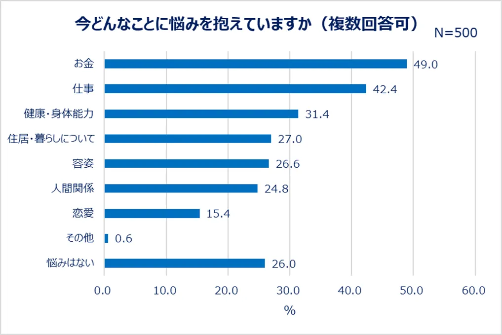 続いて、回答者が今抱えている悩みについて聞きました。その結果、7割以上が何かしら悩みを抱えていることが判明。特に「お金(49.0%)」「仕事(42.4%)」に悩んでいる女性は多いことが分かりました。