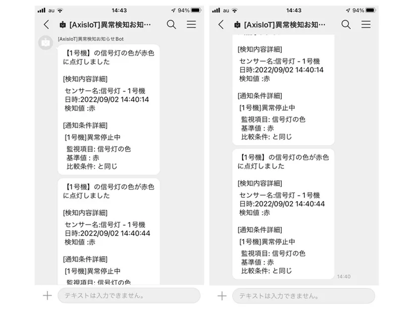 「AxisIoT」からの通知を「LINE WORKS」上で受け取るイメージ(スマートフォン)