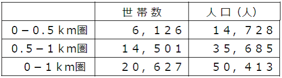 ・店舗から1㎞圏内は、3人世帯以上の構成比が大阪府平均を上回る地域です。