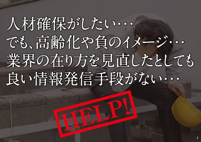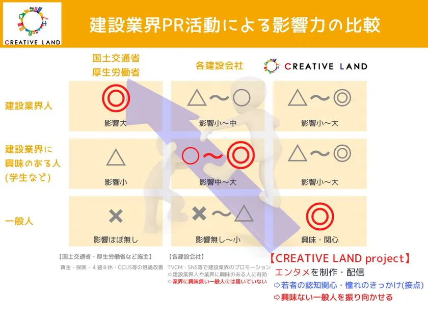 しかしながら、既存のプロモーションは建設業界人や業界に興味のある人には有効であるものの、業界に興味のない一般人に届きにくい性格のもので、新規に建設業を志す人材を増やすことに繋がっていないという現状があります。