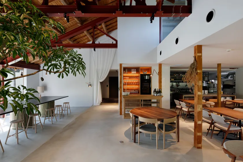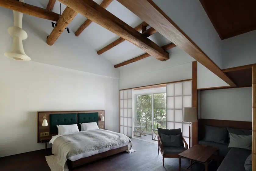 解体後、現地にてかつての痕跡や空間の魅力を現場で発掘するように設計を計画。丁寧につくられた意匠だけでなく、解体して出てきた既存の鉄骨梁や立派な木梁などをそのまま残し、また空間をつなぎ替えることで、ここにしか無い「ありのまま」を表現しています。鉄骨梁が浮かぶメインホールの吹き抜けは建物のコンセプトを象徴的に表しています。ホテルの客室は木や和紙、土などの自然素材を中心とした設えの考え方は統一させながらも、大きさや痕跡も異なる事から10室全てが異なる表情になっています。庭も既存の木々をベースに作庭し、建物だけでなく施設全体で「ありのまま」「そのまま」の良さを再発見できるデザインを目指しました。また、建物を囲んでいた塀を撤去し代わりに大きなベンチを設置するなど、賑わいを生み出す要素も取り入れ、まちとの接点を増やす設えとしています。