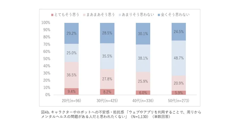 (図4b.)キャラクターやロボットへの不安感・抵抗感 「ウェブやアプリを利用することで、周りからメンタルヘルスの問題がある人だと思われたくない」(N=1,130) (単数回答)