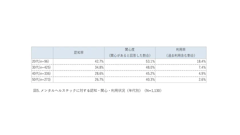 アプリなどでメンタルヘルスケアやストレスケアができる、メンタルヘルステックについては、調査参加者のうち、45%以上が関心を持っており、約1割が実際に利用していることが分かりました。若い世代になるほど関心が高く、特に20代の認知率が最も高く、2割弱が利用していることも分かりました(図5)。