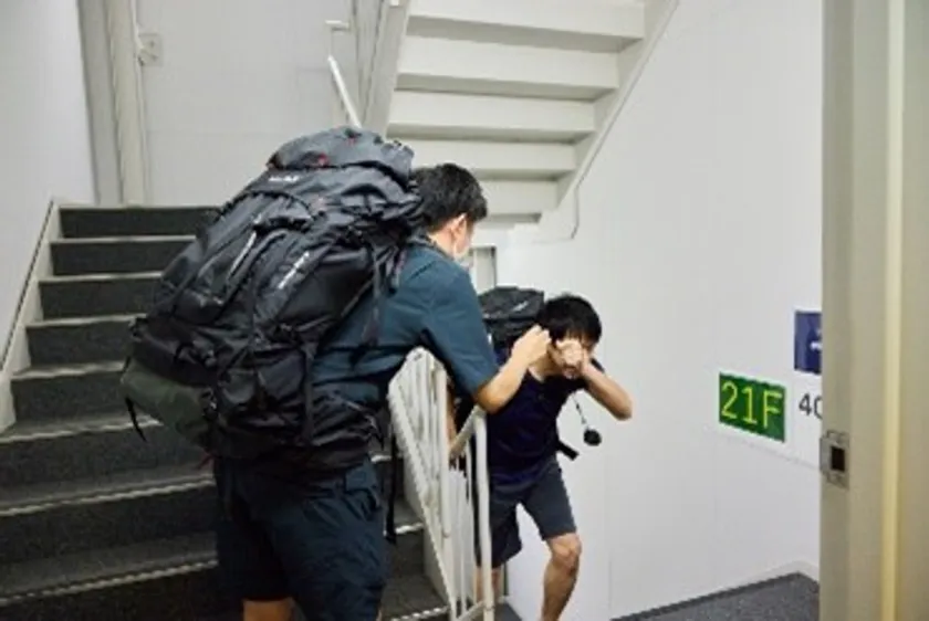 エレベーターが停止した場合を想定して、24kgの水を担いで、43階まで階段804段を上る体験をしていただきました。個人戦優勝者はスタートから7分37秒にてゴールしました。